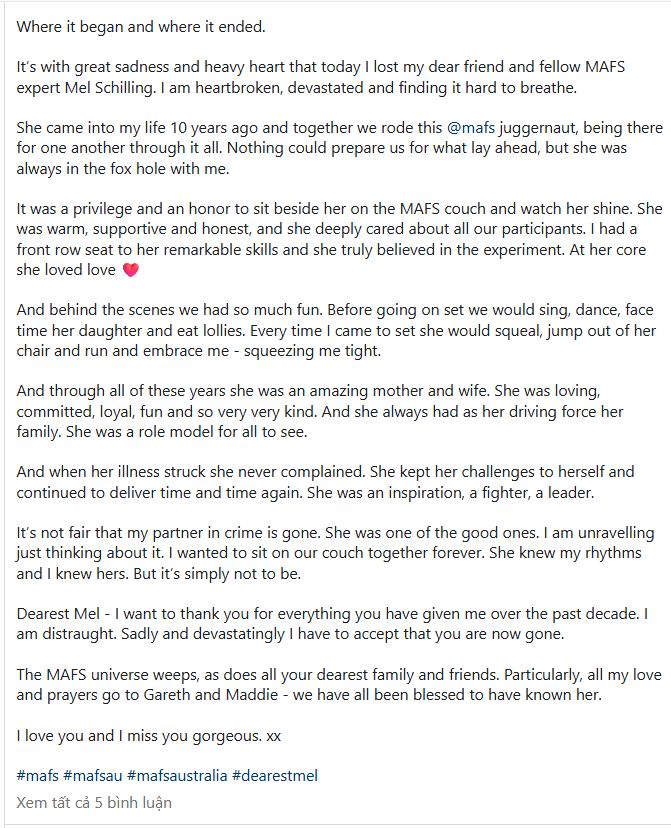 He also wrote in the caption, “Dearest Mel – I want to thank you for everything you have given me over the past decade. I am distraught. Sadly and devastatingly I have to accept that you are now gone.”