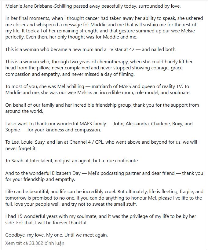 Inspired by Mel’s own positivity and vitality, John also talked about how he thinks Mel would want her fans and friends to move forward, urging people to tell those closest to them “that you love them”.